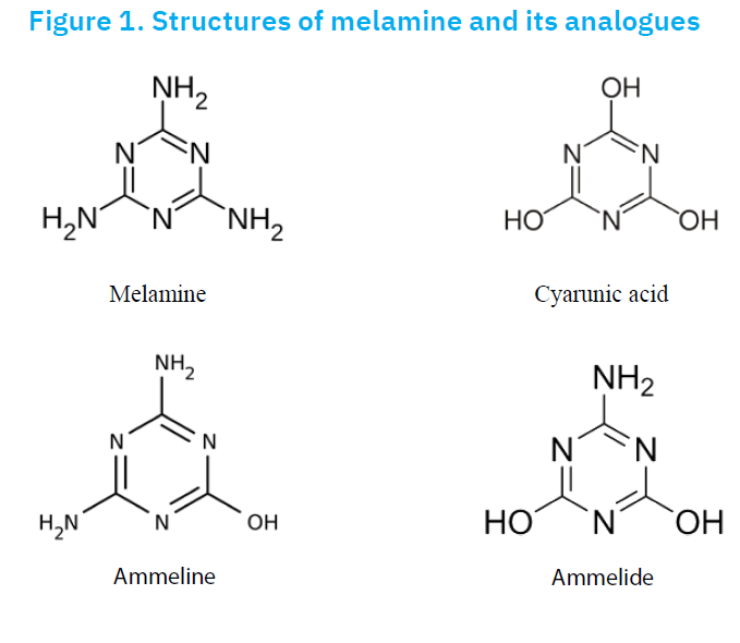 Melamine is a triazine compound containing 66.6% nitrogen. It is utilised in various industrial applications, including the production of plastics, adhesives, and fertilisers. However, melamine can also contaminate food and animal feed, as it is sometimes added to artificially enhance protein content, which can be toxic to both animals and humans. Notable food contamination incidents involving melamine include the 2007 pet food scandal and the 2008 melamine-contaminated milk scandal in China, which resulted in serious kidney damage and fatalities, particularly among children. The primary health risks associated with melamine arise from its ability to form crystals in the kidneys, potentially leading to renal failure. The body rapidly absorbs and excretes melamine, primarily through urine, as metabolism is minimal. Although acute doses are relatively low in toxicity, long-term exposure, especially through contaminated food, can pose significant health threats. In response to the melamine-related health crises in China, the WHO and EFSA established safe intake levels of 0.2 mg/kg/day for melamine and 1.5 mg/kg/day for cyanuric acid. Various countries have set maximum residue limits for melamine in food, with the United States and China permitting 1.0 mg/kg for infant formula and 2.5 mg/kg for other dairy products. In Europe, the limits are stricter, at 1.0 mg/kg for powdered infant formula, 0.1 mg/kg for liquid formula, and 2.5 mg/kg for foods. The determination of melamine and cyanuric acid in food and feed presents significant challenges. Advanced techniques such as high-performance liquid chromatography and tandem mass spectrometry are the most commonly employed methods.