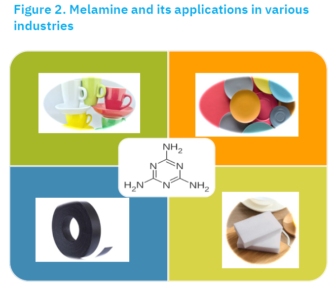 Melamine is a triazine compound with the molecular formula of C3H6N6 with a 66.6% nitrogen content. German chemist Justus von Liebig first synthesised melamine in 1834 by heating potassium thiocyanate with ammonium chloride (Zhang et al., 2007). Pure melamine is a very thermostable crystalline substance and can be hydrolysed through deamination reactions, under strongly acidic or alkaline conditions, to form cyanuric acid (2,4,6-trihydroxy-1,3,5-triazine), ammeline (4,6-diamino-2-hydroxy-1,3,5-triazine), and ammelide (6-amino-2,4-dihydroxy-1,3,5-triazine) (Fig. 1). The first use of melamine dates back to 1930 when it was combined with formaldehyde to produce a variety of products, including melamine foam and thermosetting plastics. Melamine is a widely utilised component in the manufacturing of various industrial products worldwide (Fig. 2), though it is believed that melamine may leach from these products (Ingelfinger, 2008). In addition, it has a diverse range of industrial and domestic applications, including adhesives, laminates, paints, permanent-press fabrics, flame retardants, textile finishes, tarnish inhibitors, paper coatings, and fertiliser mixtures (Liu et al., 2012). Due to its high nitrogen content, melamine was initially employed as a cost-effective protein alternative in cattle and pet feed. It is a metabolite and degradation product of the pesticide and veterinary drug cyromazine (Mariana et al., 2013). Residues of cyanuric acid can also be found in food following the use of dichloroisocyanurates as a source of active chlorine in disinfection agents. Both melamine and cyanuric acid can be present as impurities in urea-based feed for ruminants (EFSA, 2010).