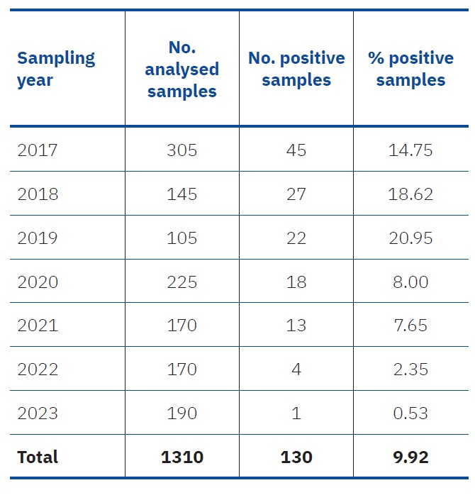 Table 1. Total number of analysed and positive samples of chicken meat for the presence of Salmonella spp. in eastern Croatia in the period from 2017 to 2023