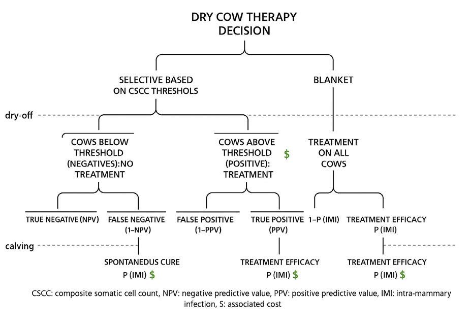 A schematic overview of the decision-making process and outcomes associated with selective versus blanket dry cow therapy is presented in Figure 1.